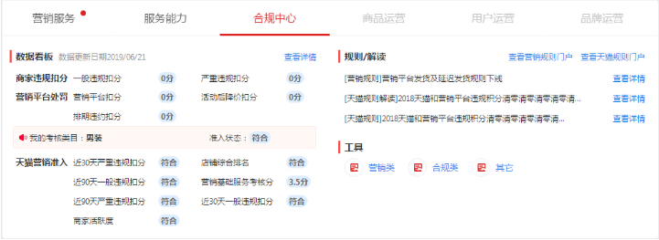 一站式呈现店铺违规现状、最新最重要的规则和解读,针对店铺经营产生重大影响的违规提前预警并提供优化建议。合规中心可以帮助商家快速掌握规则动态,在违规影响发生前及时纠正和整改,使商家可以在天猫更加顺畅经营,进一步保障消费者购物体验!
