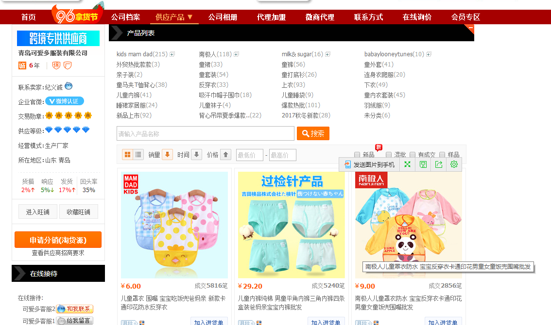 看起来这个产品还不错,我们来看看卖家的资质,点进去看了以后,发现这个卖家的货品种类非常多,价位区间不小,而且模特也不是同一个人,那么通过这几点我们就可以判断出来,这是一个分销商而不是厂家,他也是到很多地方拿货,然后去卖赚取一个差价的,那这样的供货商,我们就不考虑了。我们在选择货源的时候要选择供应产品统一的供货商,而供货产品是否统一,就从模特是否统一,产品款式是否统一还有产品价格区间大不大这三个点去进行考查。