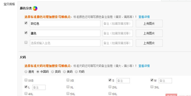 8.宝贝规格(也就是SKU,这里的颜色要尽量的选择系统上自带的,尺码后面有备注,咱们就可以利用了,可以写适合几斤到几斤,或者写你产品的卖点,店铺的营销,服务保障,如送运费等)