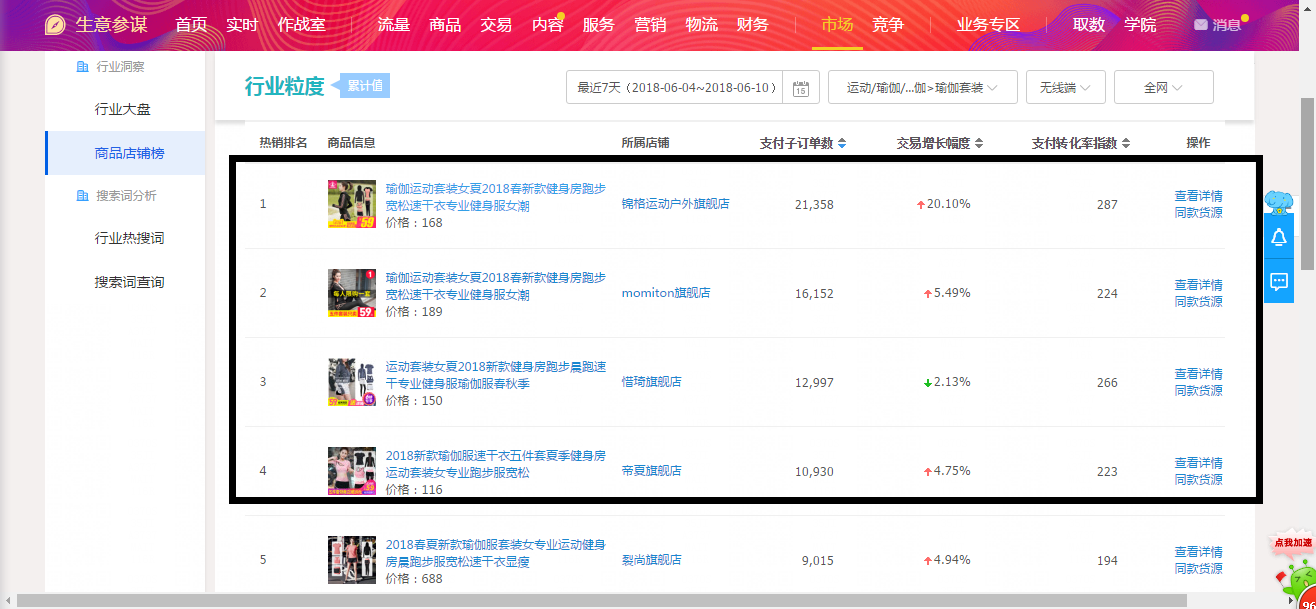 这家店铺的主推款是“瑜伽 套装”那么市场行情里面的类目选择“瑜伽 套装”就可以了!