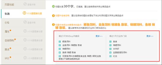 比如这个宝贝当中,我们大家看一下最近1天的进店关键词排序,发现“金鱼饲料”和“锦鲤饲料”这两个词出现的频率很高,那意味着什么?意味着这是好词啊,所以你如果想通过直通车计划拉权重的话,就要把精力集中在这两个属性词上,而不是其他的,如果你做一个广泛匹配,或者主要精力在其他词上,你会发现这种拉动效果就要差很多,很多时候甚至是反作用。